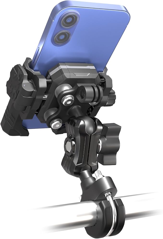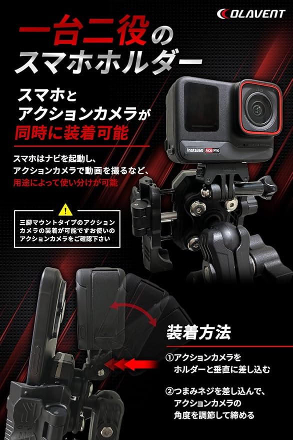 【アクションカメラも取付可能なスマホホルダー】スマホは装着しながら、アクションカメラで撮影が出来ます。ツーリングの楽しい思い出を残す際に、役立つ事間違い無し!※三脚マウントを使用するアクションカメラのみ対応。