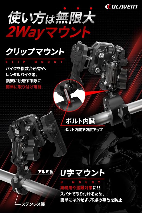 【2way使用可能なバーマウント】用途によって使い分けが出来るバーマウント。U字マウントはアルミ製とステンレス製を採用しており、盗難対策に!クリップマウントはどこでも簡単に取り付けられ、様々なシーンでお使い出来ます。