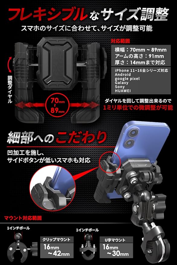 【対応参考機種】iPhone 16Pro/16Pro Max /16Plus/15Pro/15Pro Max/15Plus/15 14Pro/14Pro Max/14Plus/14 iPhone 13 Pro Max /13 Pro /13 / 12 Pro Max /12 Pro /12 / 11 Pro Max /11 Pro /11 / XS Max / XR / X / 8 Plus/ 7 Plus 7/ 6 SE 3 / SE 2 /Samsung Galaxy S10 / S10+ / S9 / S9 Plus / S8 / S8 Plus / Sony / Huawei / Google pixel /Galaxy アーム細部は凹加工を施しており、サイドボタンが低いスマホも装着可能です。