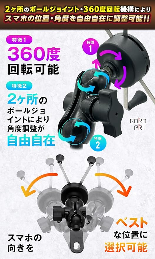 ✅【スマホの位置・角度が自由自在】本製品が有する✅2ヶ所のボールジョイントと✅360度回転機構により スマホの位置・角度を自由自在に調整可能‼ スマホ画面の向きをベストポジションにすることが可能です‼