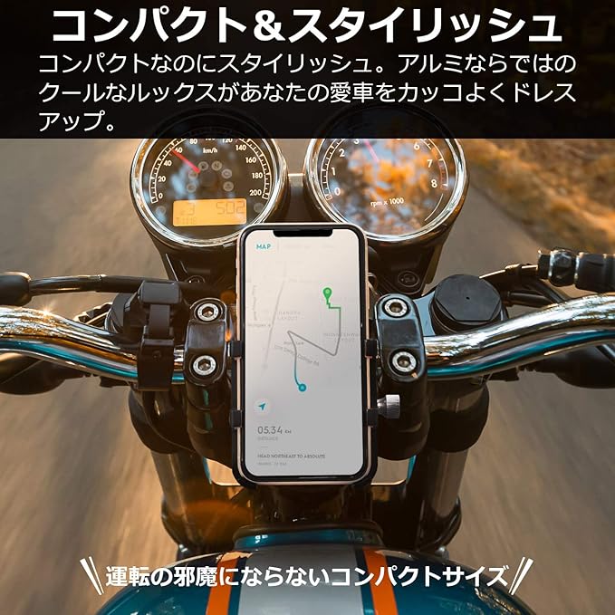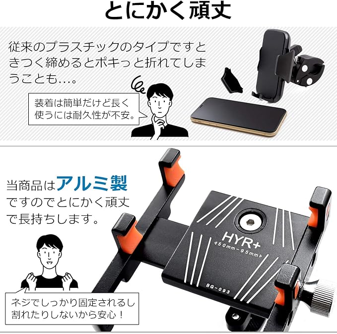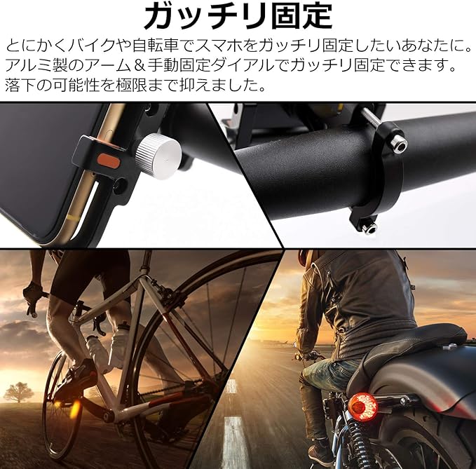✅【ガッチリ固定】とにかくバイクや自転車でスマホをガッチリ固定したいあなたに。アルミ製のアーム&手動固定ダイアルでガッチリ固定できます。落下の可能性を極限まで抑えました。