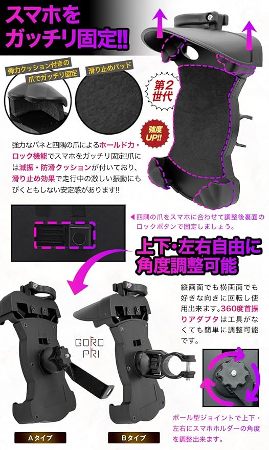 ✅【強力固定で落下防止】強力なバネや減振・防滑クッション付きの4つの爪、滑り止め背面パッドによる✅万全な防振・防滑設計‼スマホをガッチリ固定するため、走行中の激しい揺れにもびくともせず落下の心配はありません