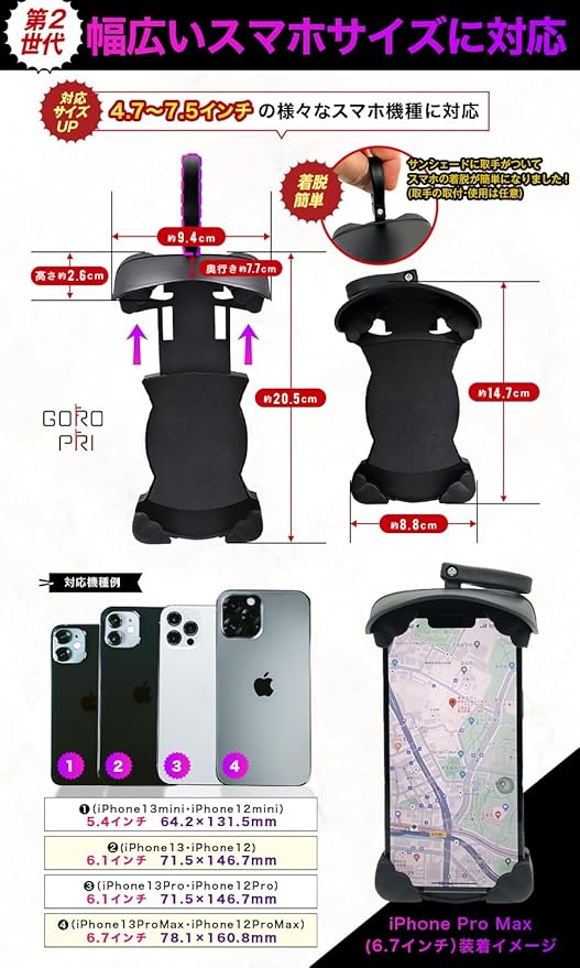 ✅【第2世代】2023年12月出荷分より一部の仕様が変更になりました。①強度アップ‼②サンシェードに取手を取付けて着脱がより簡単に‼(取り付けは任意)③対応可能なスマホの最大サイズが大幅にアップ‼