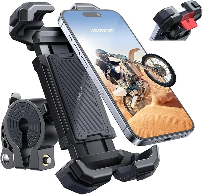 ️【上下連動構造‼️1秒で片手取付 ⭐ 取外す】Joyroom バイク スマホホルダーは、上下連動式の構造を採用し、 スマホをわずか1秒で簡単に取り付け、取り外しできます。走行中、いつでもスマホを取り外して写真やビデオを撮影し、友人と共有することができます。