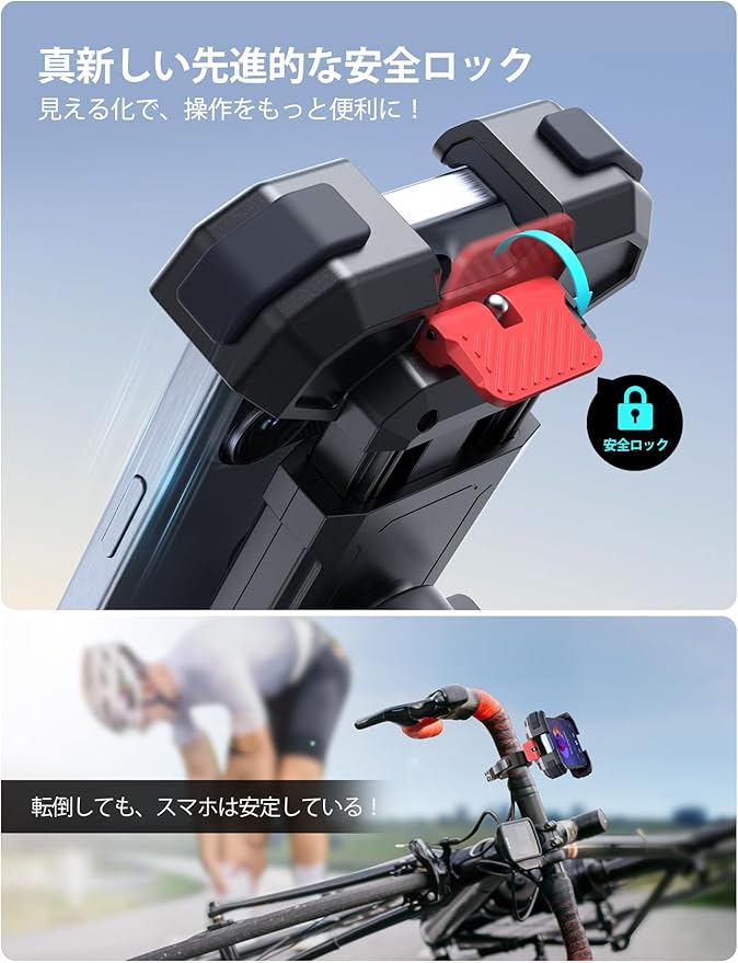 ️【2024新進化‼️見える安定ロック 操作をもっと便利に!】バイク 自転車用スマホホルダーには上部に大きな安定ロックが装備されており、操作がより簡単で素早くなりました。強力な安定ロックにより、スマホは常に所定の位置にしっかりとロックされ、スマホが緩んだり落下する心配がないようにすることができます。