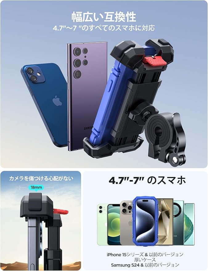 ️【たくさんのデバイスに対応可能‼️】オートバイ 自転車用スマホホルダーは15mm~40mmのハンドルバーに適して、オートバイ、自転車、電動スクーター、ベビーカー、電動自転車、ロードバイク、トレッドミルなどに使用できます。 4.7インチ~7インチの携帯電話、厚さ(携帯電話ケースを含む)≤ 18mm、iPhone、Samsung、Xiaomi、Google Pixel、VIVO、One Plusなどに適します。iPhone 16 / 15 / 14 / 13 / 12 / 11 シリーズ、Galaxy S24/S23/S22など❗