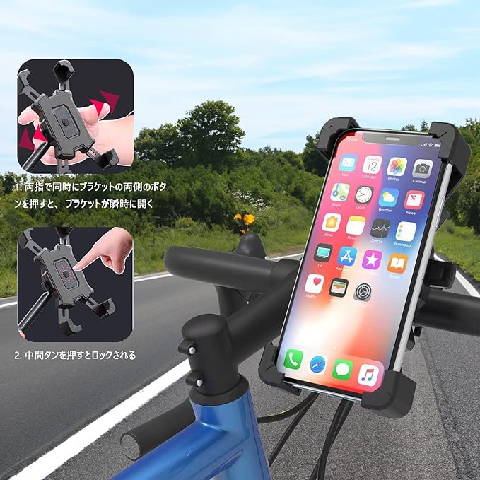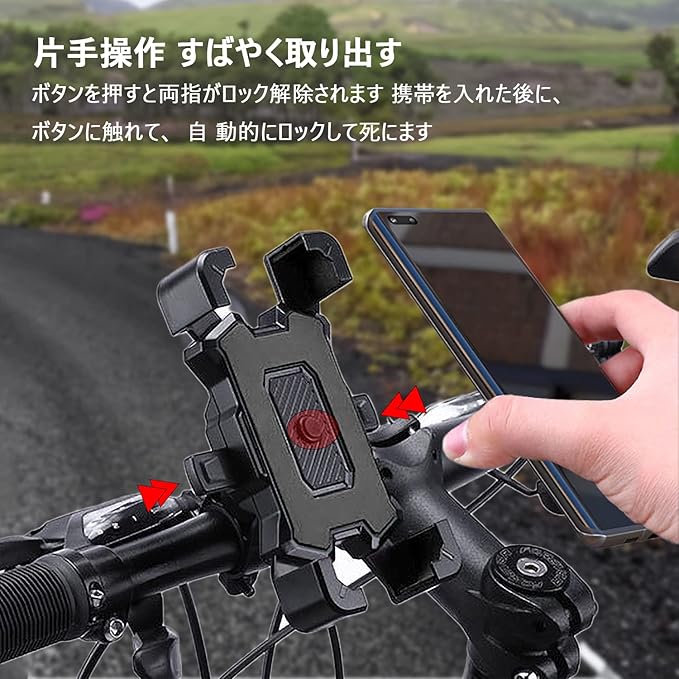 ▶1sで快速に取り付け・外し:自転車 スマホホルダー両側に革新的なスイッチ設計で伸縮アームを一秒でロックし、スマホを置いて中央のロッグボタンに触れると。自転車 スマホホルダーは 伸縮アームの収縮方法を従来の手動回転ギア収縮から自動収縮にアップグレードされました。片手でも一秒に取り付けて超便利です。従来方法よりも、半分の時間でできます。