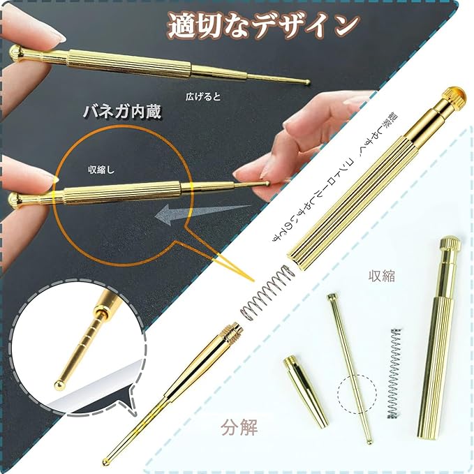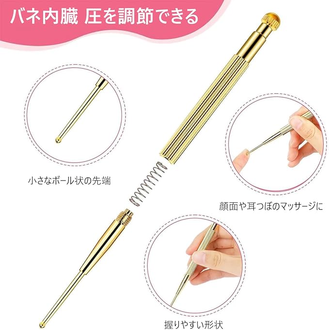2.【バネ内臓】スティックには、バネが内臓されており、つぼ押しの圧を調節できます。初めてのご購入にもおすすめとなっております。ばね式なので、あなたの耳ツボをやさしく刺激してくれます。ツボ押し棒は、丸い先端と握りやすい形状で効果的にツボを刺激できます。