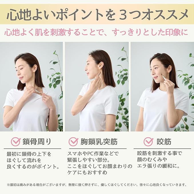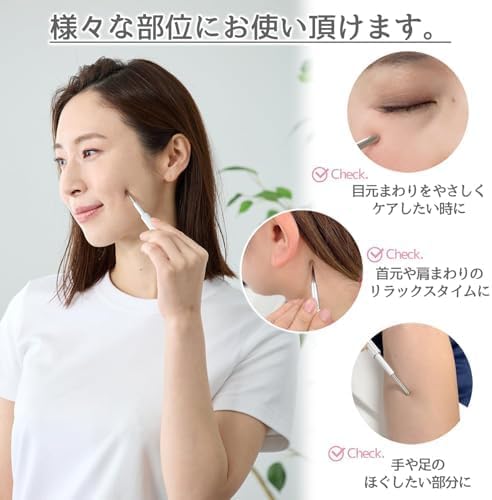 【さまざまなケアに使える1本】 顔まわりや手足など、さまざまな部位にお使いいただける多機能アイテム。手では届きにくいポイントも、程よい刺激でリフレッシュしやすく、コンパクトなサイズ感で初めての方にも扱いやすい設計です。気軽に取り入れられるセルフケアアイテムとして、ご好評いただいています。