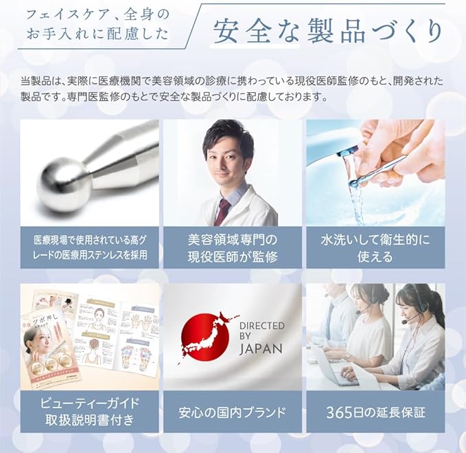 【ビューティーガイド付き】 当製品は、正しい使い方を記載した「ビューティーガイド」付きです。 ・フェイスラインケア ・手足のツボ押し ・ほうれい線・たるみケア ・筋肉の 角度や指圧の強さについてビューティーガイドで確認しながら、お手入れを進めていただけます。