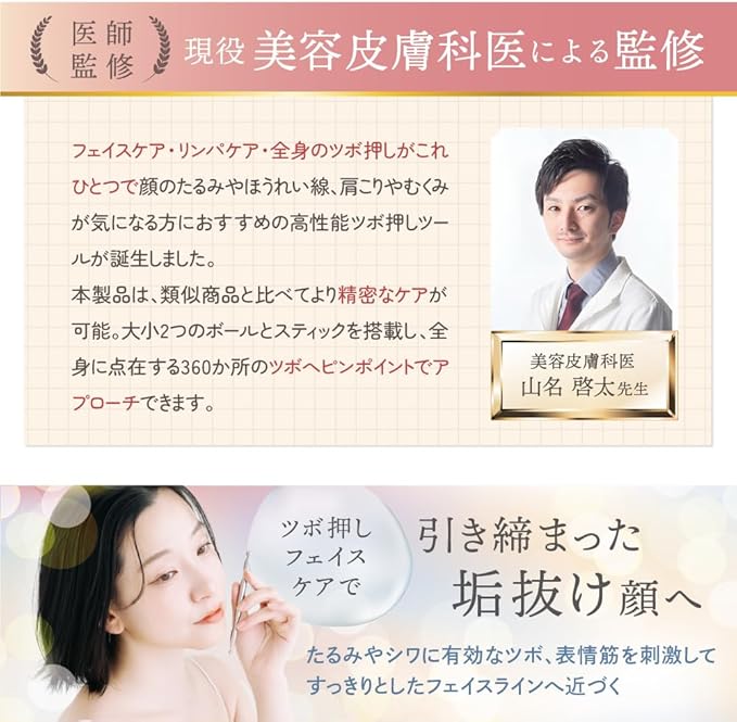 【現役美容皮膚科医監修】 美容皮膚科医 山名啓太先生監修のもと、「美しさ 健康」を徹底追求して商品化。ツルンと滑らかな材質のため、ホームエステ感覚でお使いいただけます。加齢による肌のたるみ、シワのお手入れ、筋膜リリース、手足のツボ押し、首肩のケアと、コレ1本でさまざまな用途に使える超万能なアイテムです。ありそうでない極上の圧感で、滞ったリンパの流れも解消!フェイスラインのむくみ・たるみにフォーカスし、若見え効果にこだわりました。