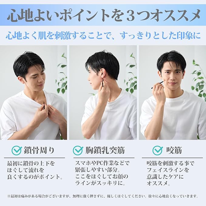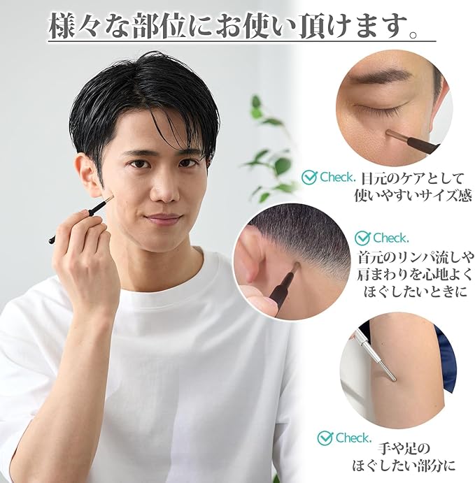 【さまざまなケアに使える1本】 顔まわりや手足など、さまざまな部位にお使いいただける多機能アイテム。手では届きにくいポイントも、程よい刺激でリフレッシュしやすく、コンパクトなサイズ感で初めての方にも扱いやすい設計です。気軽に取り入れられるセルフケアアイテムとして、ご好評いただいています。