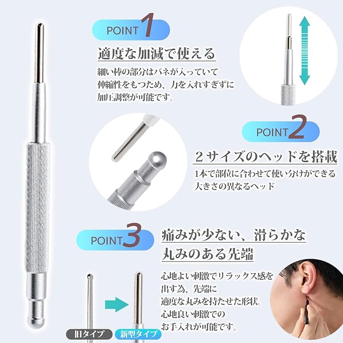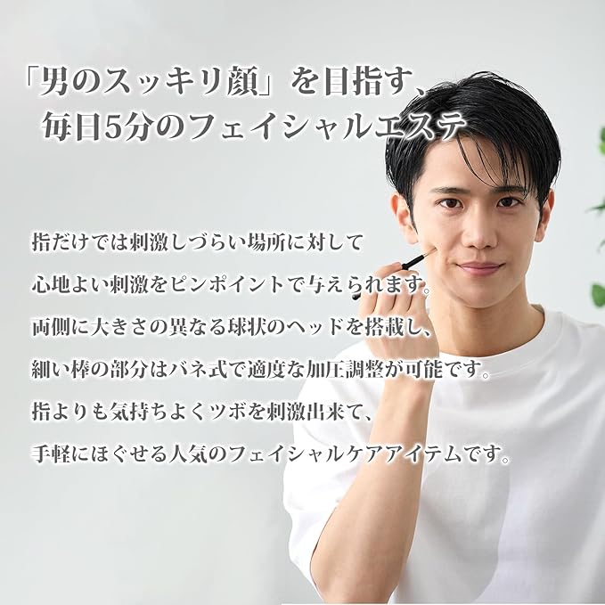 【大小2サイズのヘッド&スプリング構造】 両端には大きさの異なる球状ヘッドを搭載。顔の細かい部位から肩や脚、腕などにも使いやすく、細身のスティック部分はスプリング内蔵で、加減を調整しながら使いやすい設計です。顔に使用する際は、摩擦を避けるためにオイルやクリームとの併用を推奨しています。