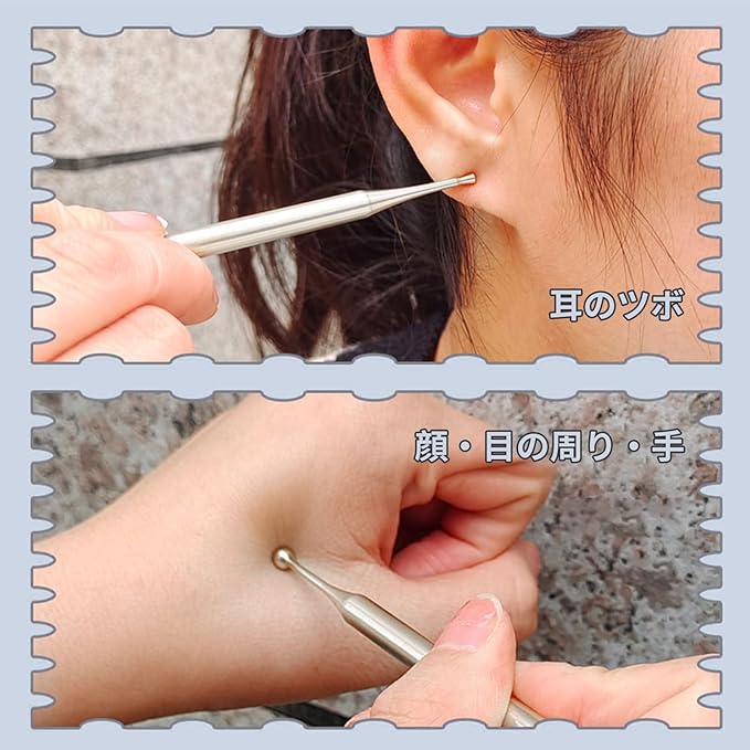 【使用方法】ペンを持ち、選択したツボにペンの先端を向け、同じ力で上、下、左右に圧力を加え、痛みの点を注意深く探し、痛みの点を検出した後、耳のツボのパッチを押します。を指さします。