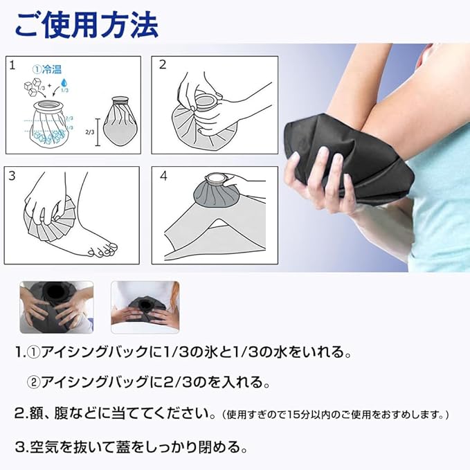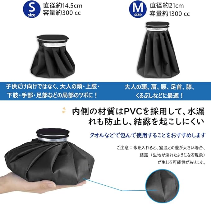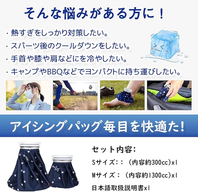 ★【セット内容物】Sサイズのアイスバッグ(容量約0.3リットル) 1、Mサイズのアイスバッグ(容量約1.3リットル) 1、日本語説明書 1 S:子供に向いているだけでなく、大人の手首、足首などのところにも 適用しています。M:直容量が1.4L、首筋、すね、膝、腰などのところに適用しています。★氷を入れると、室温との差が大きい場合、結露(生地が濡れたようになる現象)が生じる可能性があります。タオルなどで包んで使用することをおすすめします。
