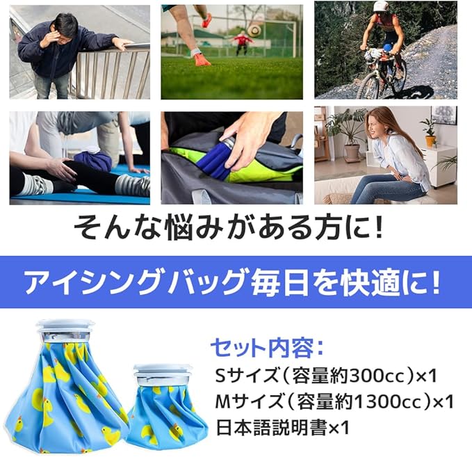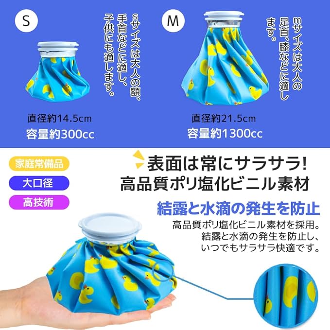 【セット内容物】Sサイズのアイスバッグ(容量約0.3リットル) 1、Mサイズのアイスバッグ(容量約1.3リットル) 1、日本語説明書 1 ★氷を入れると、室温との差が大きい場合、結露(生地が濡れたようになる現象)が生じる可能性があります。もちろん氷をたくさんある方が冷却時間が長くなりますが、相対的に結露する可能性も高くなります。室内室外の温度差が大きいときに使う場合は、水と氷の割合を1対1にすると良いとアドバイスしています(タオルなどで包んで使用することをおすすめします)。【♥温かいヒント♥】:氷嚢に少し塩を加えると、冷却時間が少し長くすることができます。商品写真はできる限り実物の色に近づけるよう徹底しておりますが、 お使いのモニター設定、お部屋の照明等により実際の商品と色味が異なる場合がございます。