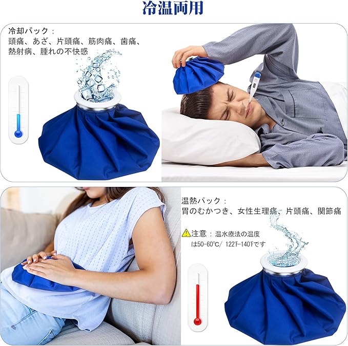【冷温両用】保冷効果を逃がさず、長時間のアイシングが可能です。運動後に膝、肘、足首、手首を迅速かつ簡単に冷却ます。冷感用法の場合は、アイスバッグに氷と水を3分の2入れて。(★注意:氷を追加した場合、室温との差が大きいと結露が発生する場合があります。タオルなどで包むことをお勧めします。)温熱用法の場合は、氷嚢に温水を入れて。 (★注意:温水用法の温度は50-60℃/ 122℉-140℉です)