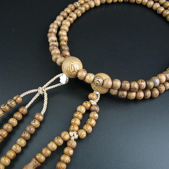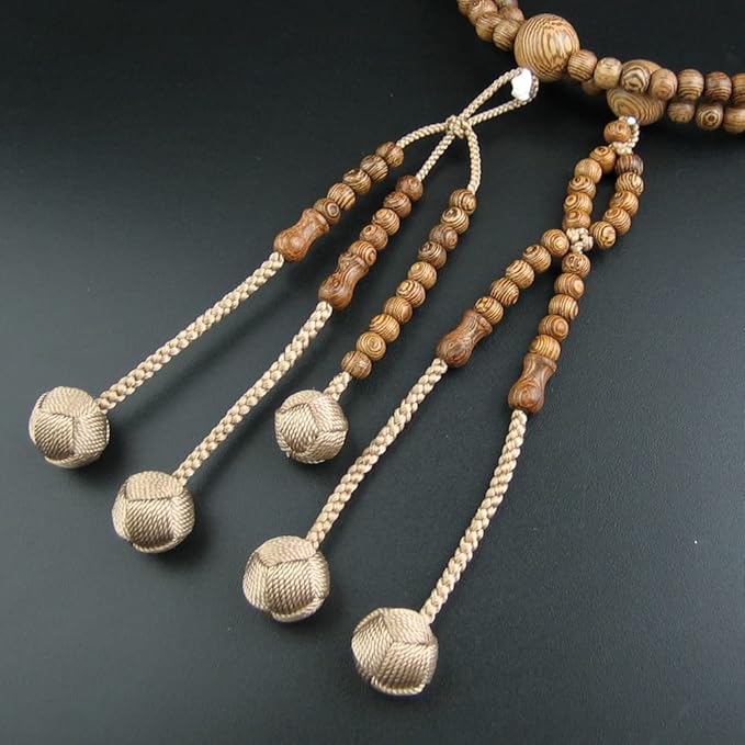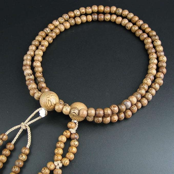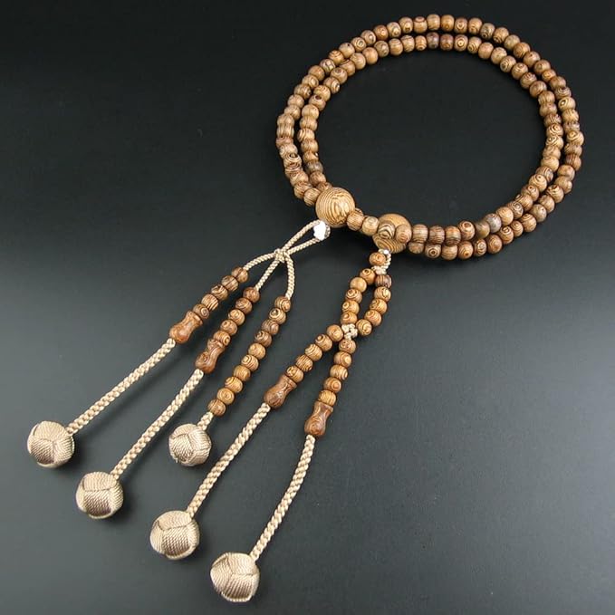 日蓮宗男性女性通用数珠正式なお数珠でございます。素材は、風合い良い艶消し加工の鉄刀木でございます。鉄刀木ははっきりな木目があり、非常に重たく硬い木で、まるで「鉄の刀のようだ」ということからその名を呼ばれています。 その重硬で緻密な材質から、「紫檀(シタン)」「黒檀(コクタン)」と並び、唐木の三大銘木として古くから珍重されてきました。今回は特殊な木ビーズ加工技術を使用して、表面の木目がくっきりとしていて、丸い模様が完全に表示されています。