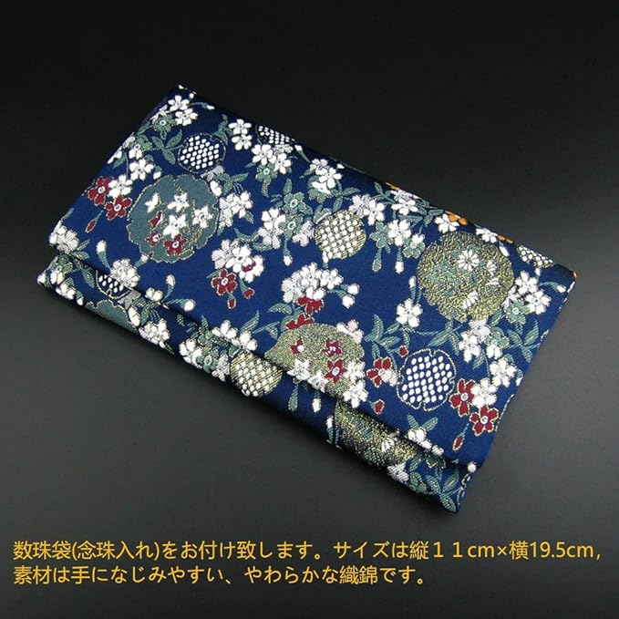 数珠袋(念珠入れ)をお付け致します。数珠袋の生地はレーヨンでの織錦です。手になじみやすい、やわらかな素材です。シルクのように柔らかく光沢がある,レーヨンは耐久性や染色性がシルクより優れています,長く使えば洗濯はできます。寸法:縦10cm 横19cm/留め具はマジックテープで、開閉が簡単です。