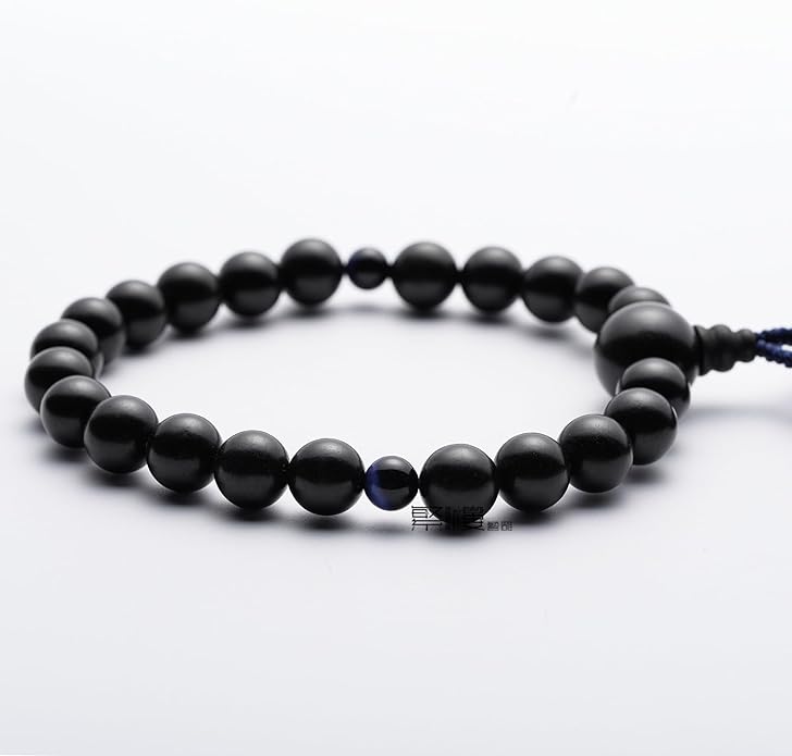 念珠の材料:念珠は全部本場の黒木から作られ、中には18ミリメートルの親珠を1個、12ミリメートルの主珠を22個、また8ミリメートルの天珠を2個含み、共に25個となり、お客様の都合のため、念珠袋(17.5cm*8.5cm)も付けます。