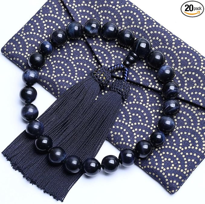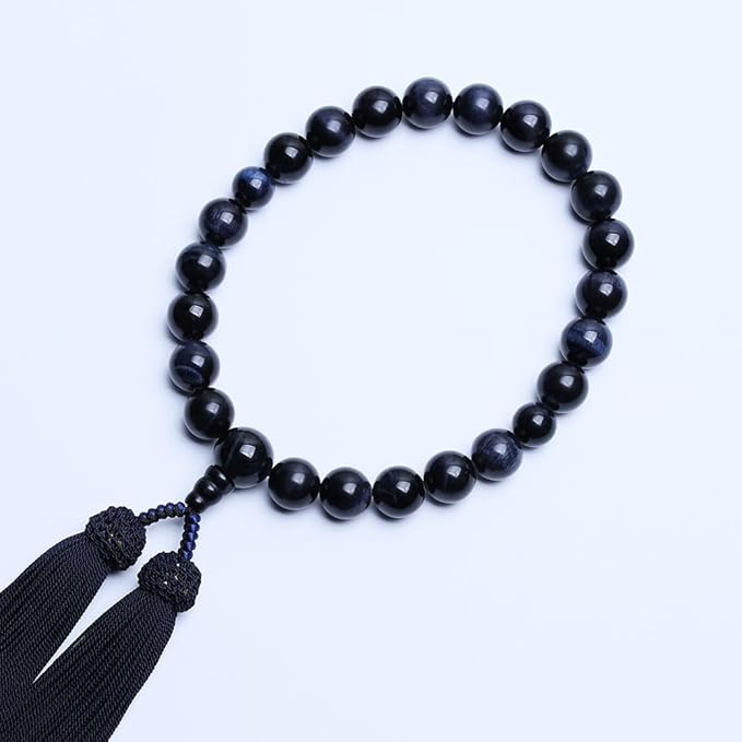 男性が手にするのにぴったりサイズです。主玉:青虎目石12mm、天玉:青虎目石10mm、親玉:青虎目石14mmとなります。頭付房(鉄紺色)。