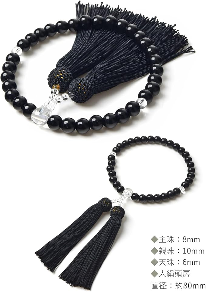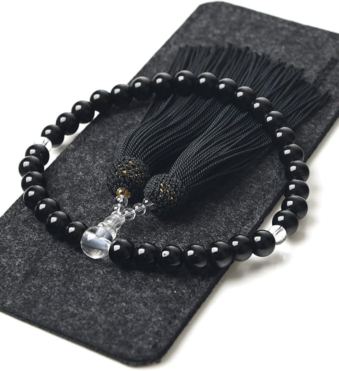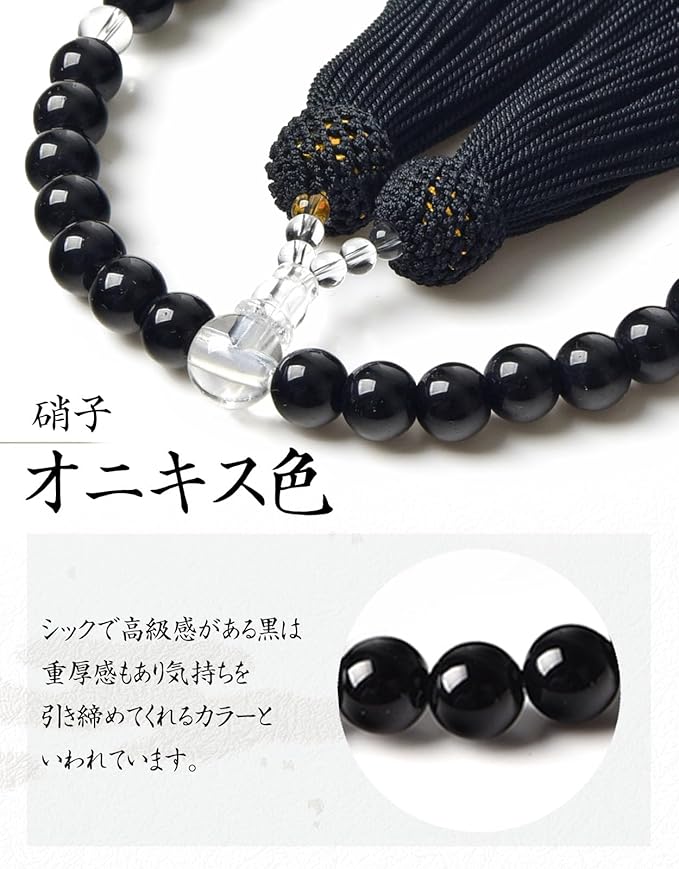 【EsuonHappiness】数珠 女性用 8mm 頭房 硝子 略式数珠 すべての宗派で使える 選べるお色 法事 葬儀 数珠袋付き 天然石色 人絹房 (オニキス色)