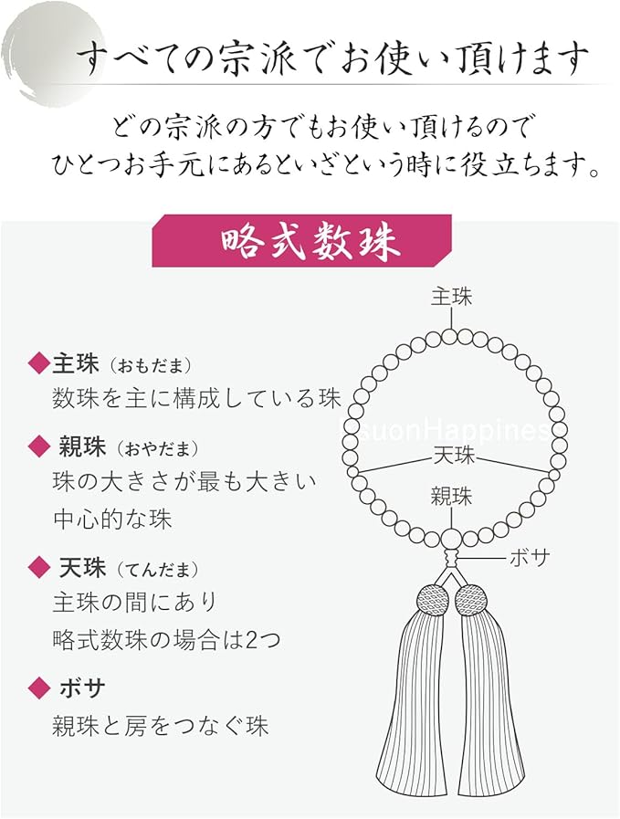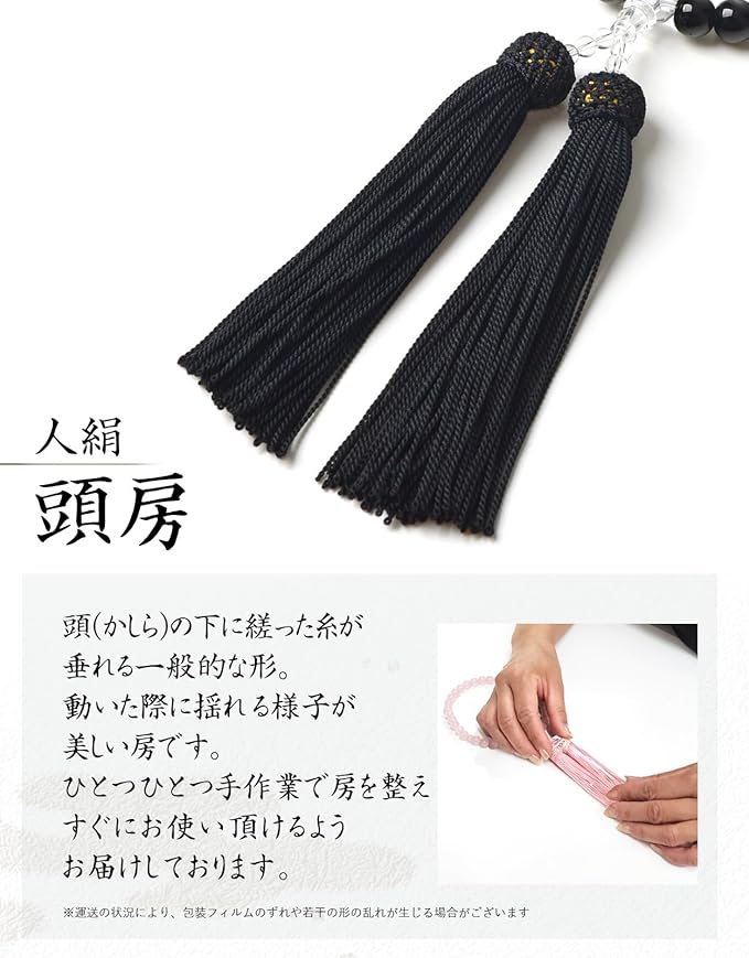 【サイズ】数珠を主に構成している珠(主珠:8mm玉)、玉の大きさが最も大きい中心的な珠(親珠:10mm玉)主珠の間にあり、略式数珠の場合は2つ(天珠:6mm玉)、人絹頭房