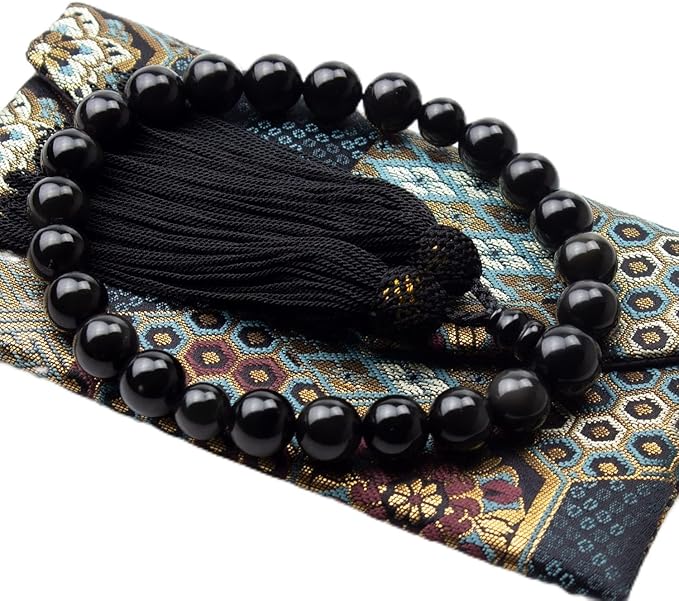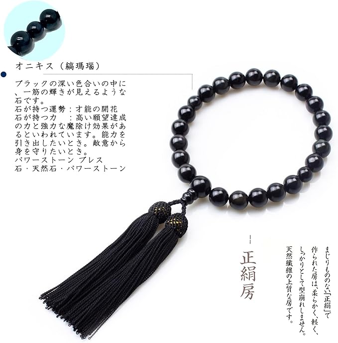 【数珠素材】:●親玉:オニキス(約12ミリ) ●主玉:オニキス(約16ミリ)●天玉:オニキス(約10ミリ)●房の素材:正絹頭付房(黒色)