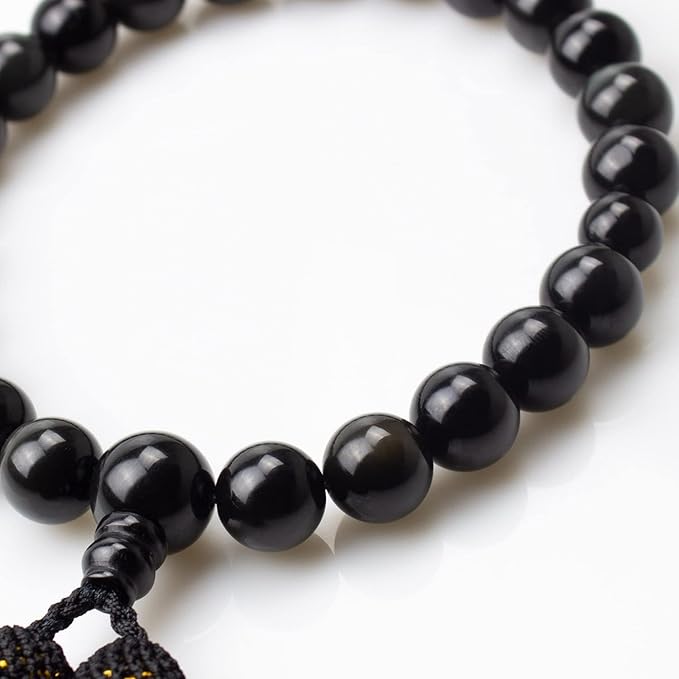 【数珠の特徴】: ◆オニキス ◆ 「悪霊から身を守る石」とされ、肉体の内側にある本能を目覚めさせ、運動能力を刺激して向上させる力があると伝えられています。また葬式や法事などフォーマルの場で違和感なくお持ち頂けるお数珠です。