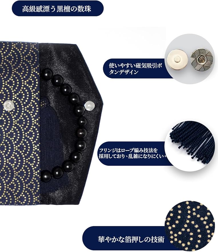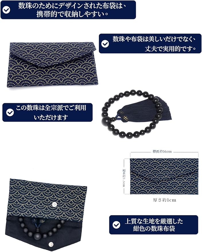 【コンパクトな収納袋付き】 8.5cm x 16cmの和柄収納袋が付属し、数珠を安全に保管し、持ち運びが便利です。