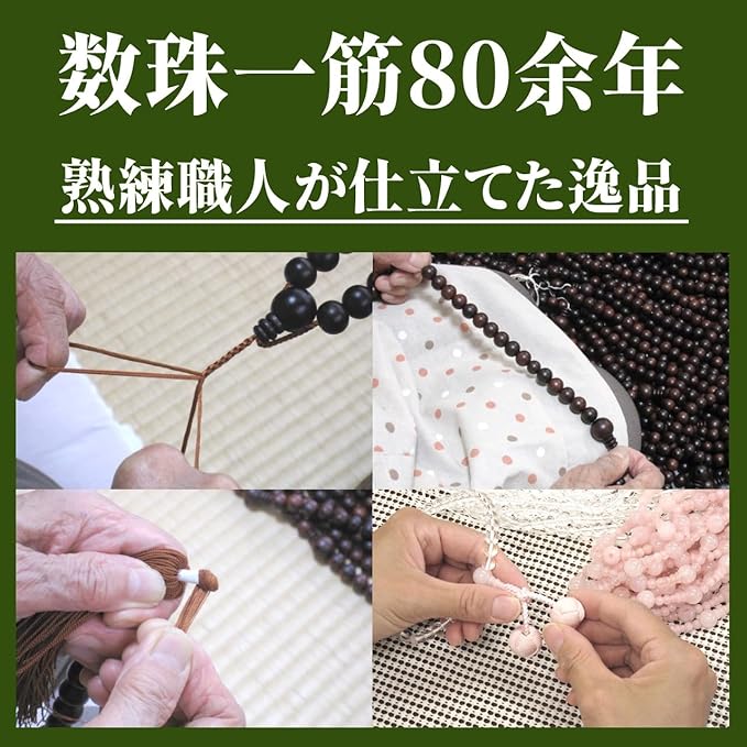 ▼ 安心の日本製数珠 ▼ 創業80余年の老舗数珠メーカー「念珠堂」が製造いたします。熟練数珠職人が丹精込めて仕立てた逸品をお届け。