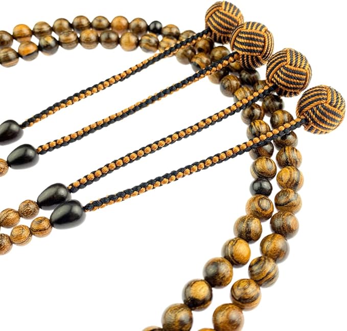 真言宗男性用の正式なお数珠でございます。素材は、虎皮檀でございます。虎皮檀は虎の皮のような模様があるので虎皮檀というが、この木目ははっきりしていて、木は硬く、しかも表面は繊細で数珠を作るのに適した材料です。アクセントには、黒檀を使用させて頂きました。色合いバランスが素敵なお数珠に仕上がっております。 房は、丈夫で扱い易く、型崩れを起こさない小田巻梵天房を採用させて頂きました。軽量で長期間のご利用が可能です。