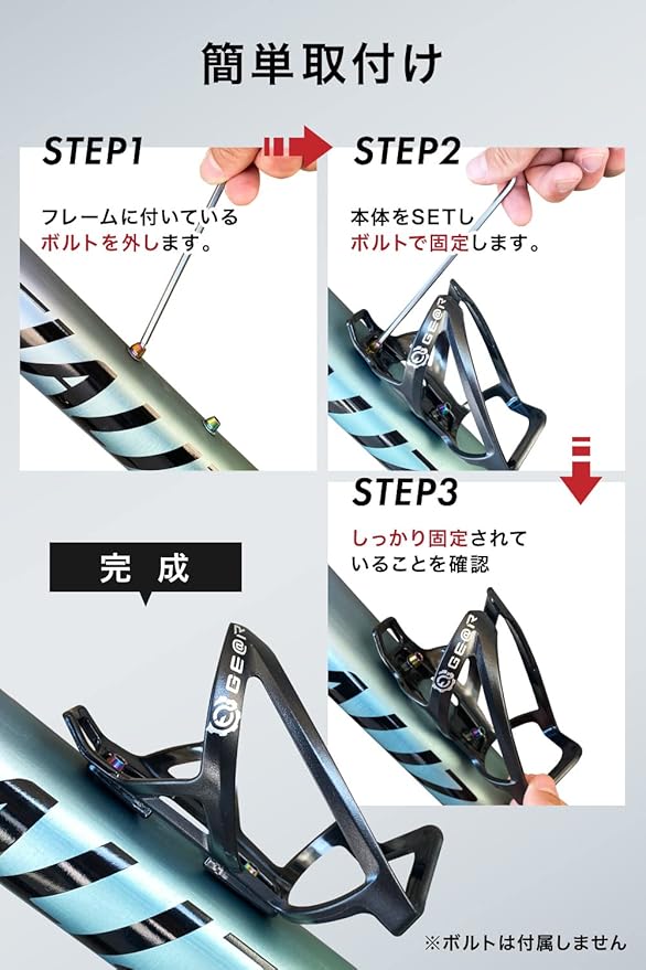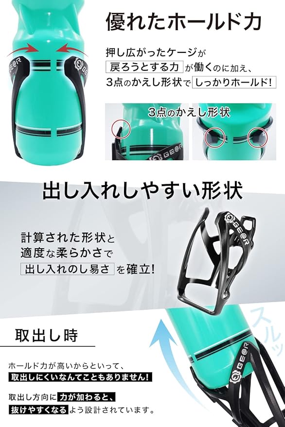 ボトルケージには、サイクルボトルの他にツールボトルやペットボトル、水筒、ウィンドブレーカ、輪行バッグ等、様々なギアを装着可能。