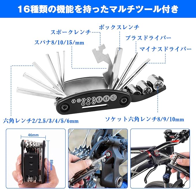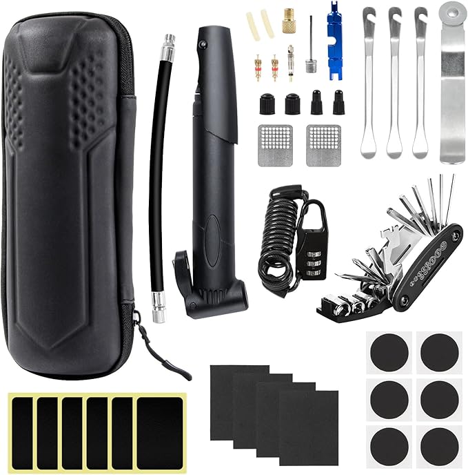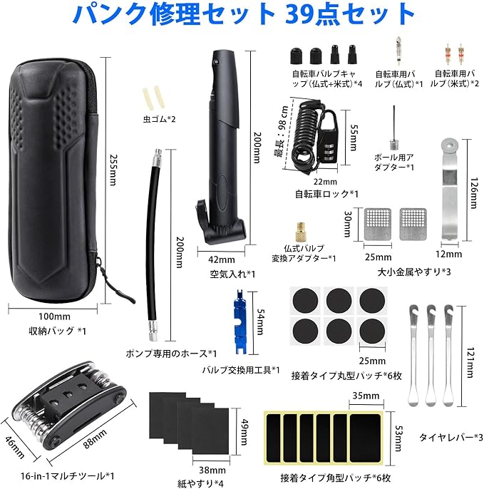 2023新登場充実の自転車パンク修理キット:パンク修理キット、空気入れセット、16-in-1マルチツール、自転車ロック、収納バッグ、バルブセット、合計39点が含まれています。自転車修理キットはやはり常備しやすくなっています。ワイヤーロックにもあり、不便な時、サドル、ヘルメットやその他の貴重品は、自転車のハンドルや後部座席に一時的にロックすることができます。いつでも対応できるので、安心です