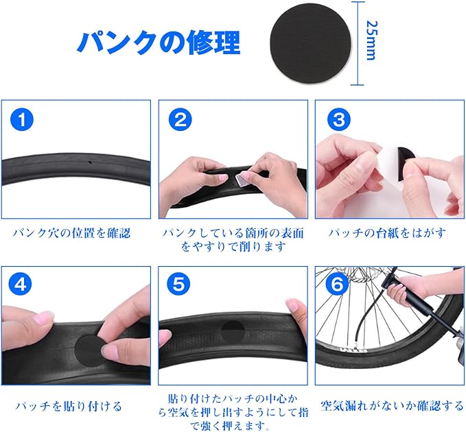 緊急時タイヤパッチ修理:金属やすり、丸型パッチ、タイヤレバーがついていますので、パッチで簡単に修復できます。安く済むし短時間で修理可能なので、逆に自転車屋さんへ行く手間が省けます。粘着剤不要のパッチは、修理が簡単で、急なパンクに役立ちます。