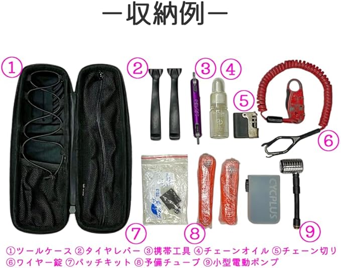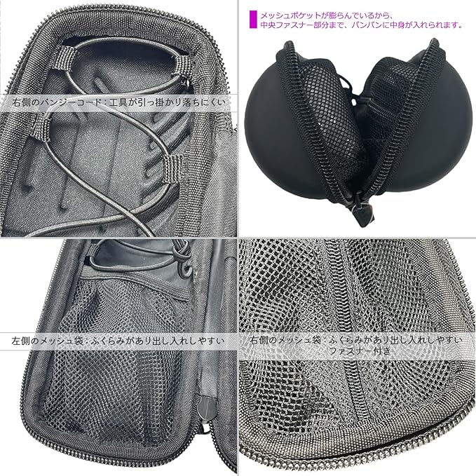 【コンパクト&収納力◎】 携帯工具・タイヤレバー・CO2ボンベ・ミニポンプまでしっかり収まるMサイズ。整理しやすく、必要なものをスッと取り出せます。