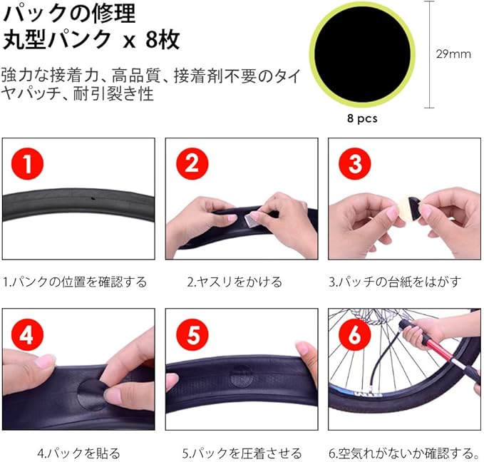 パッチ修理簡単、粘着剤不要:通勤、通学、また旅行の時にいつかパンクが急にパンクする恐れがありますよね。自転車修理キットがあればパンク修理は、キットがあれば自分でパンク修理ができ、自転車屋さんを探す必要もなくなります。粘着剤不要のパッチは、緊急時の対応にとても重宝します。