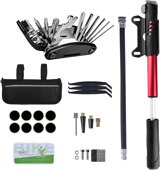 パッケージ内容: ●収納バッグ 1 ●16-in-1マルチツール 1 (マイナスドライバー、プラスドライバー、ボックスレンチ、スパナ8/10/15/mm、六角レンチ2/2.5/3/4/5/6mm、スポークレンチ) ●空気入れセット: ミニポンプ 1、自転車フレーム 1,ボルト 2、風船/浮き輪用アダプター 2、ボール用アダプター 1、ポンプ専用のホース 1