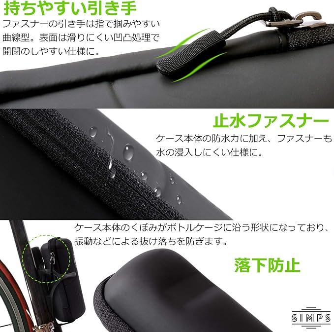 ケース本体は水をはじく特殊素材でできており、ファスナーは止水ファスナーとなっており水の浸透しにくい仕様となってます。ファスナーの引手は指でつかみやすい曲線型となっており表面は滑りにくい凹凸処理で開閉がしやすい仕様でケース本体もボトルゲージに沿う形状ですので振動などによる抜け落ちを防ぐことができます。