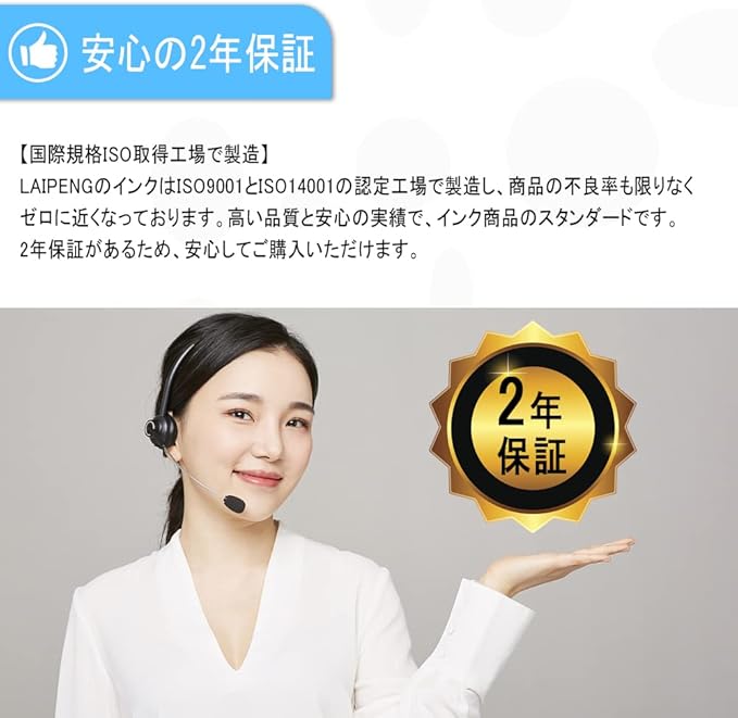 【国際規格ISO取得工場で製造】 LAIPENGのインクはISO9001とISO14001の認定工場で製造し、不良品率は 0.1%以下。高い品質と安心の実績で、インク商品のスタンダードです。2年.があるため、安心してご購入いただけます。