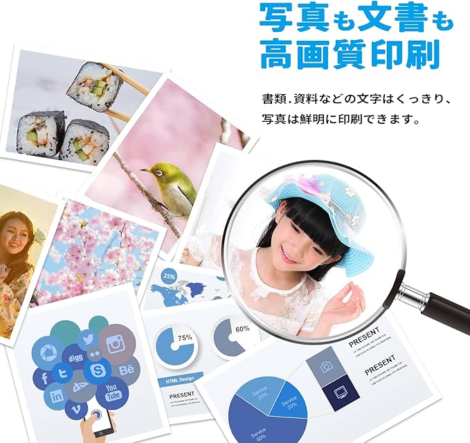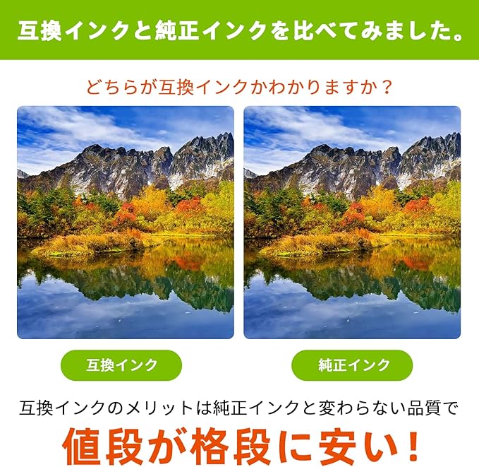 【印刷品質】キヤノンと互換性のあるインクは耐久性、耐光性、着色力に優れ、発色が鮮やかなインクを採用します。※純正品と同様に使用可能な互換インクカートリッジです。純正品と比べて遜色のない美しさです。