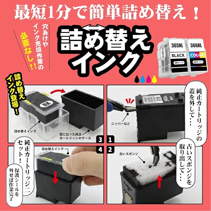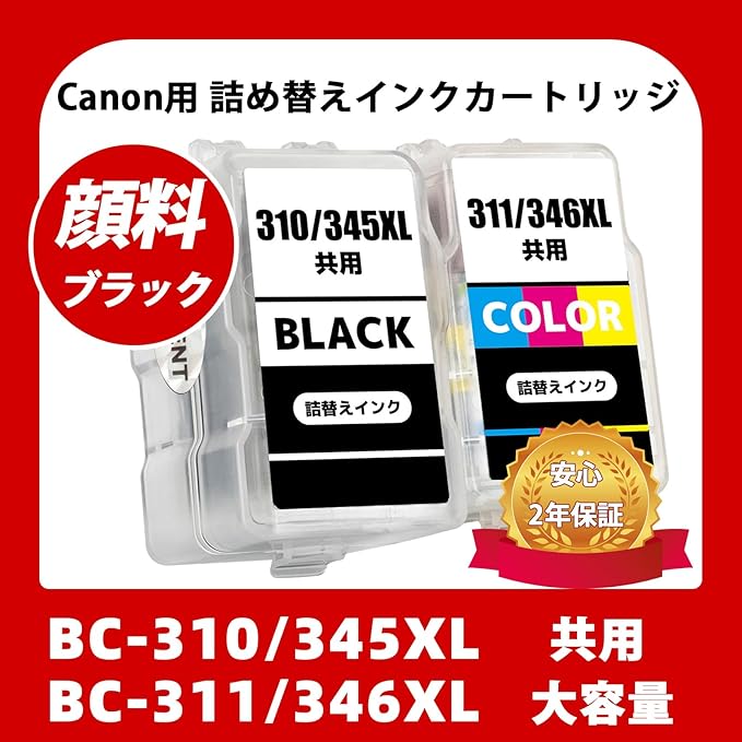 【セット内容】BC-310/345XL共通(BK/顔料ブラック) + BC-311/346XL共通(CL/カラー) 合計2本セット最新互換詰め替えインク 手袋1組 取扱説明書付き ※取扱説明書には詰め替えに関する説明や動画のQRコードをスキャンして、取扱い作業のビデオが入手できます。【蓋の開け方についてご注意】細いマイナスのドライバー 1本で直ぐに開きました。多分横はなかなか開けにくいですが、お尻の方からだとすぐにパカッとふたが取れました。