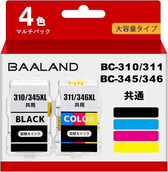 【BAALAND】キャノン BC-310 BC-311 大容量 bc-310 顔料ブラック bc-311 染料カラー 2個セット 詰め替えインクカートリッジ BC-345 BC-346 共通