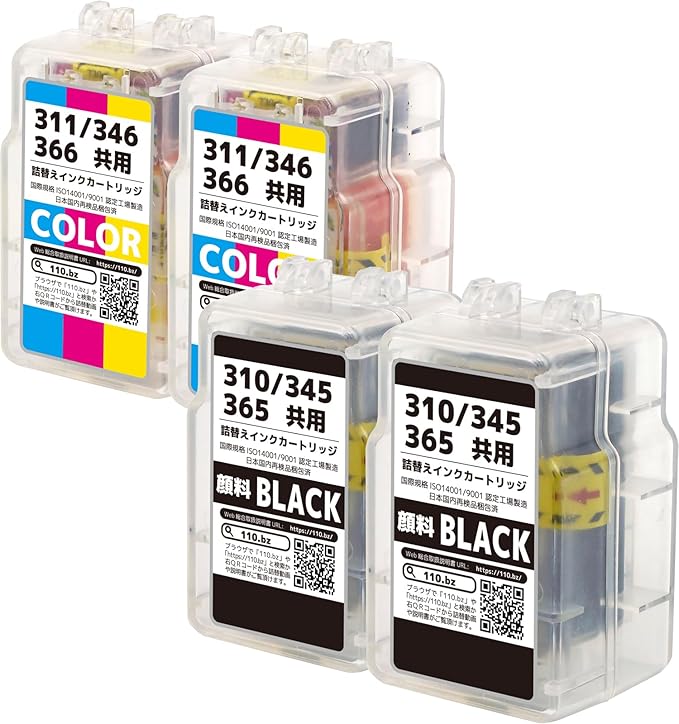 ◆【セット内容】:BC-310 / BC-345 / BC-365 (BK/顔料ブラック) 2 + BC-311 / BC-346 / BC-366 (CL/3色カラー) 2 【合計4本セット】 最新 互換 《詰め替えインク》 (大容量) 純正より20%増量、高品質。 ※ウェブ取扱説明書には詰め替えに関する説明や動画が御座いますので必ずご確認下さいませ。封筒または商品に印字されております。