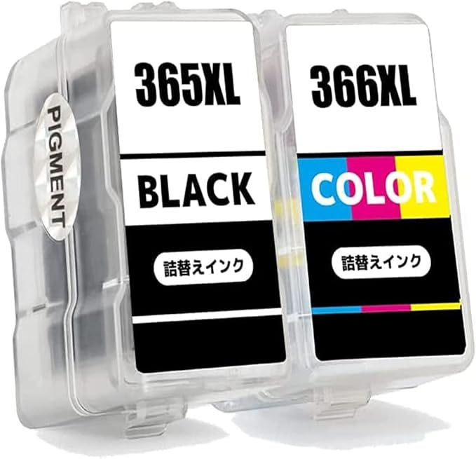 【セット内容】BC-365XL(BK/顔料ブラック) + BC-366XL(CL/カラー) 合計2本セット最新互換詰め替えインク 手袋1組 取扱説明書付き ※取扱説明書には詰め替えに関する説明や動画のQRコードをスキャンして、取扱い作業のビデオが入手できます。【蓋の開け方について】細いマイナスのドライバー 1本で直ぐに開きました。多分横はなかなか開けにくいですが、お尻の方からだとすぐにパカッとふたが取れました。