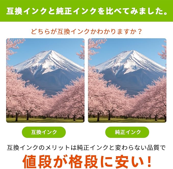 【印刷品質】キヤノンと互換性のあるインクは耐久性、耐光性、着色力に優れ、発色が鮮やかなインクを採用します。※純正品と同様に使用可能な互換インクカートリッジです。純正品と比べて遜色のない美しさです。