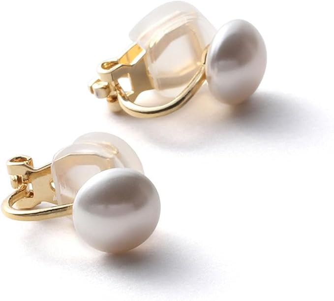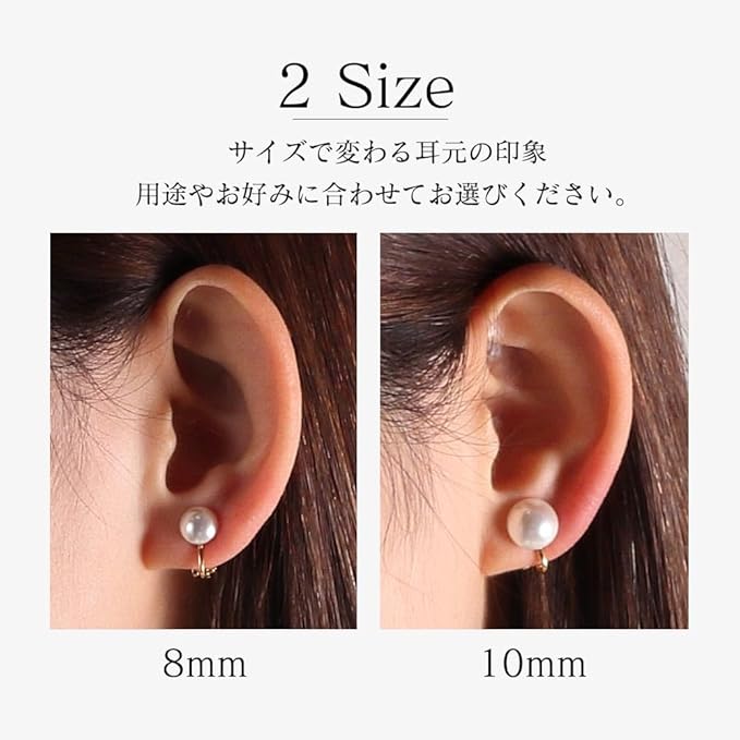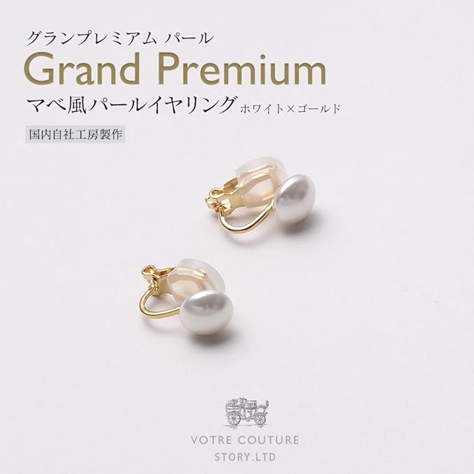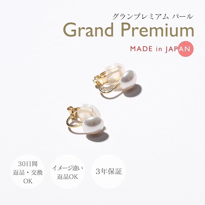 サイズ(約)/イヤリング:縦1.5㎝ 横0.9㎝、珠サイズ:8mm、素材/宝石:グランプレミアムパール(クリスタルパール)、クリップイヤリング:真鍮製(金メッキ)、シリコンクッション