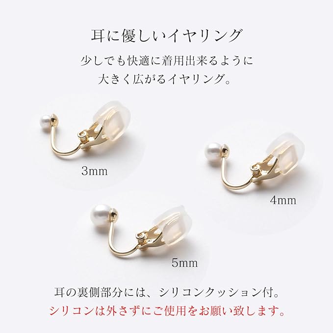 【耳に優しいソフトクリップの留め具】 留め具部分が大きく開き、着用しても痛くなりにくいクリップ式。耳にあたる部分はシリコンでソフトにフィットします。