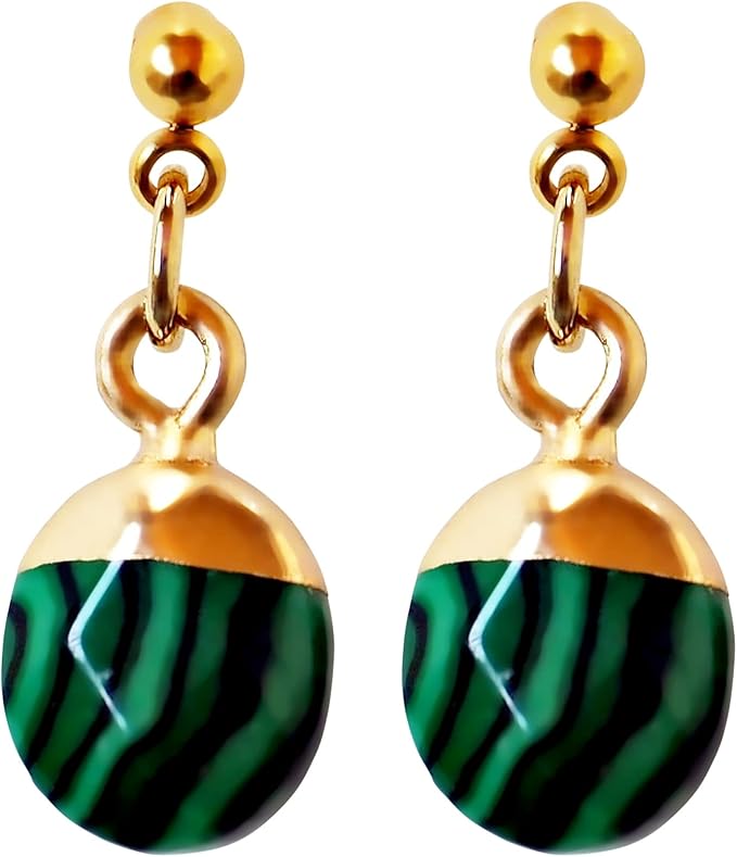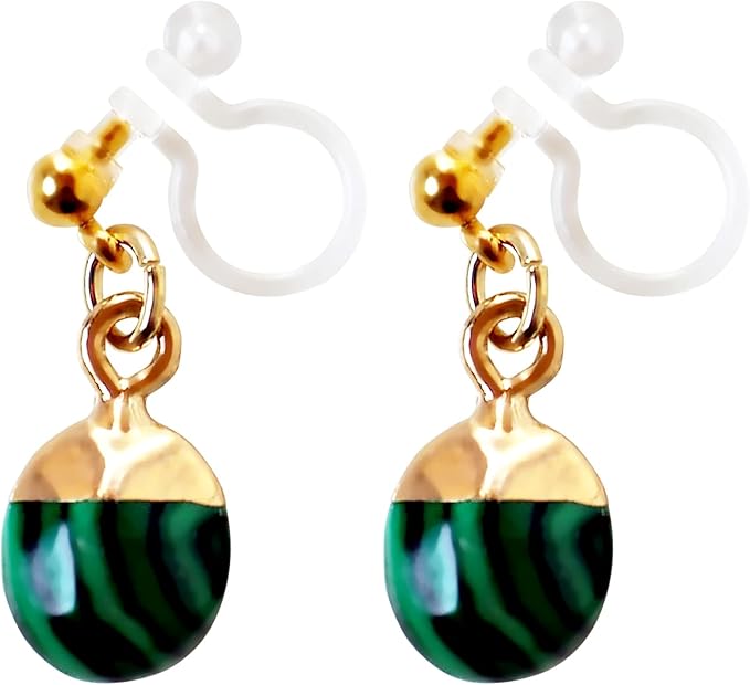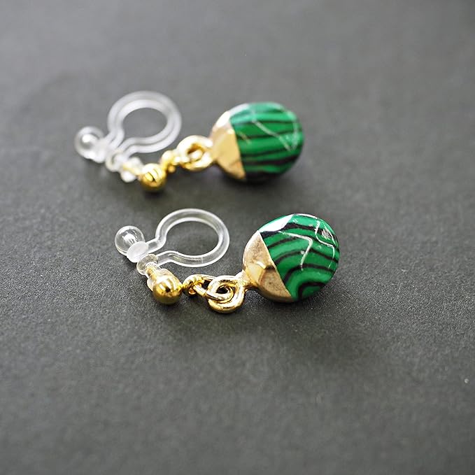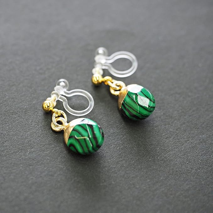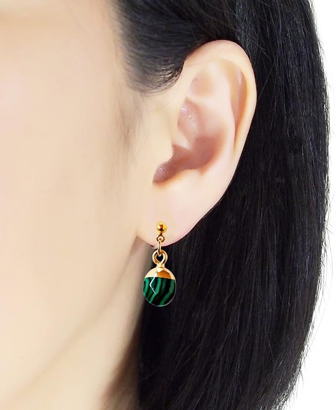 【商品説明】まだらな緑と黒のストライプ模様がエキゾチックでエレガントな孔雀石(マラカイト)の天然石ノンホールピアスです。小粒ながらもリッチ感のあるイヤリングで華やかさを演出します。 デイリーのカジュアルスタイルからパーティーや特別なイベントなどの装いにマルチに使える優秀なアクセサリーです。どの角度からも美人スタイルができあがるこのイヤリングをあなたのワードロープに加えてみるのはいかがですか。