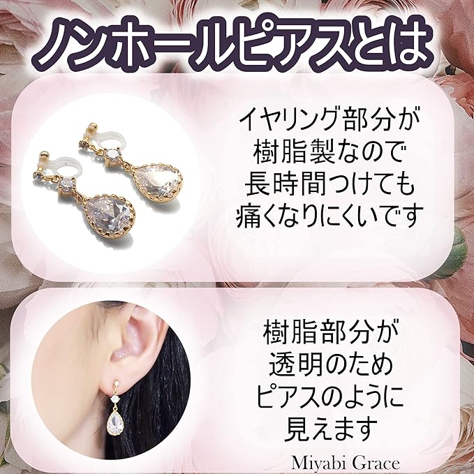 ◆痛くない!ピアスに見えるノンホールピアス♪ イヤリングは痛くて毎日つけるのはちょっとと思ってしまいますよね。痛くなく長時間着けられるイヤリング、それが樹脂製ノンホールピアスです♪ イヤリングを着けていることも忘れてしまうほどです! またイヤリング部品部分が透明で耳の上では“見えない”状態です。まるでピアスを着けているように見えます。「痛くない、ピアスに見える」、いいところ揃いのノンホールピアスです♪ イヤリングは毎日楽しみたいあなたに最適のアイテムです。